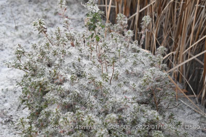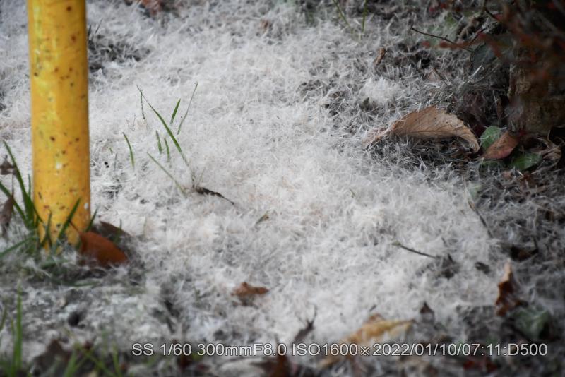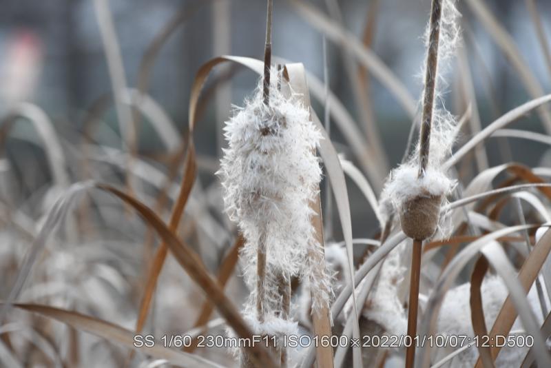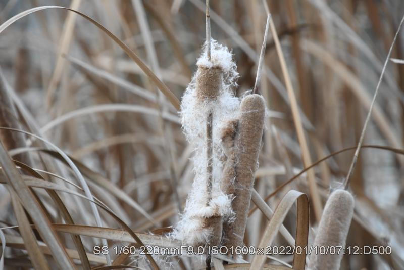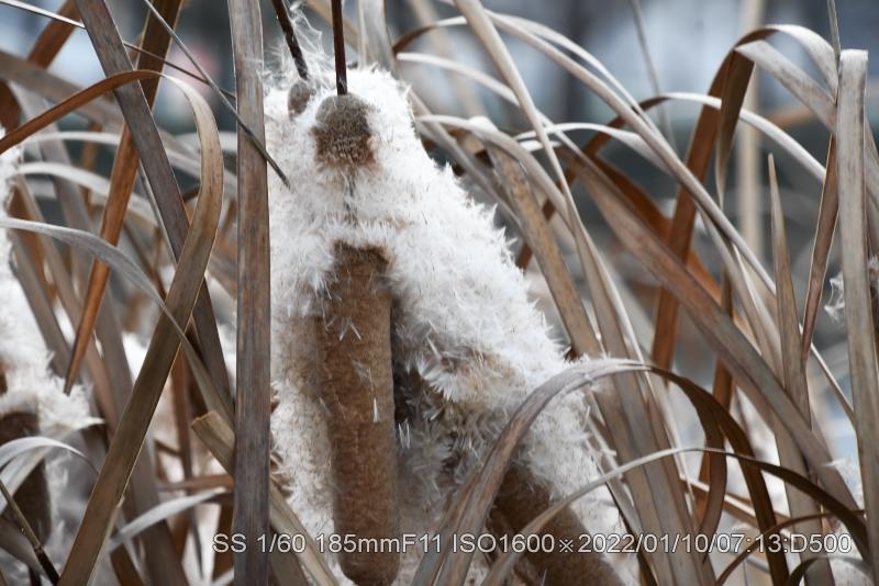 学名:Typha latifolia L.)は、ガマ科ガマ属の多年草の抽水植物である。別名、ミズクサ。抽水性の植物:根が水中にあり、茎や葉を伸ばして水面上に出る植物。よく池の周辺で見かける。弁天池の今朝は霜が降ったような、雪が積もったような。