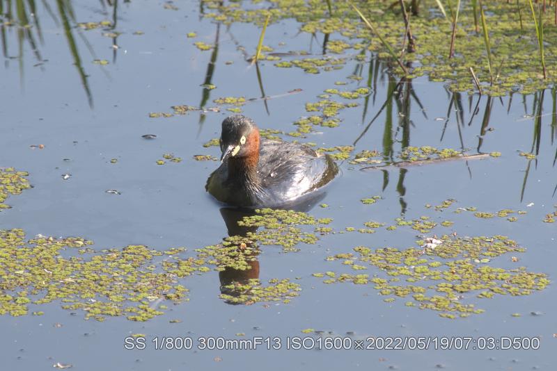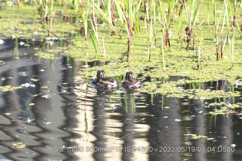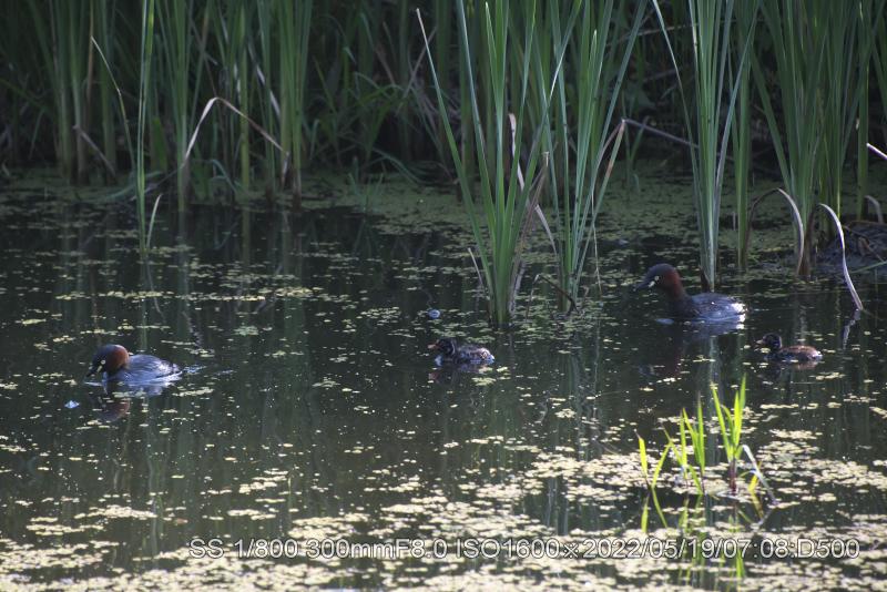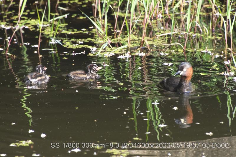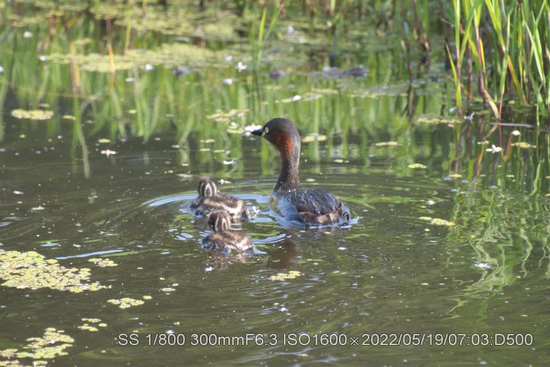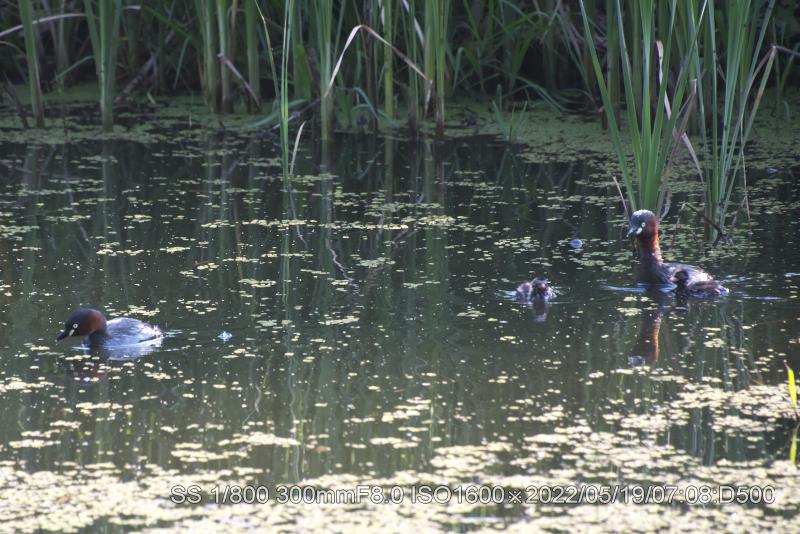 深北緑地カイツブリ雛は生き残ってた。元の巣から50メータぐらいに居ました。ホントにチィチャイ。両親もいたが、雛は雌に寄り添ってた。まずは、やれやれ。