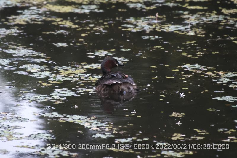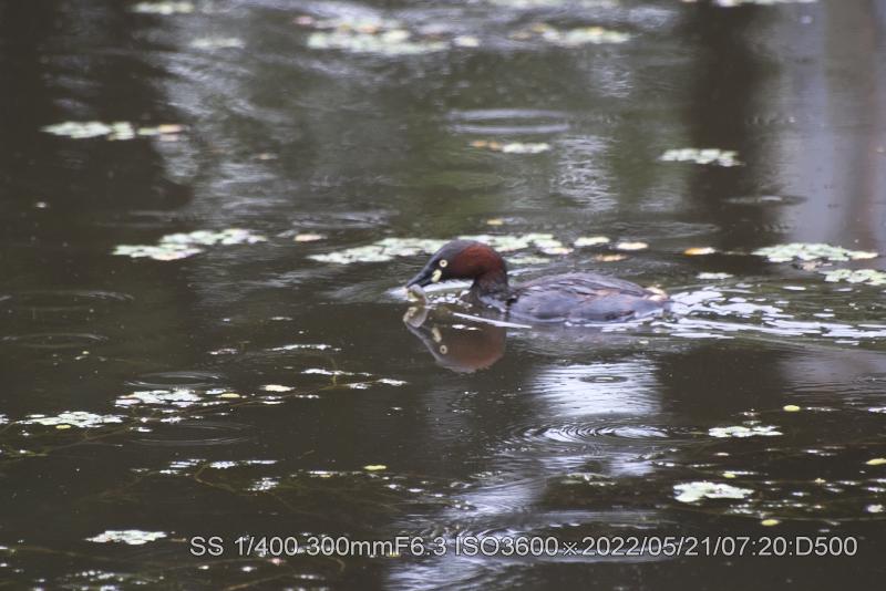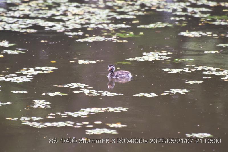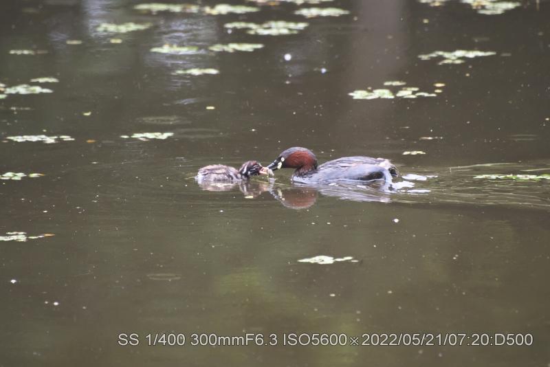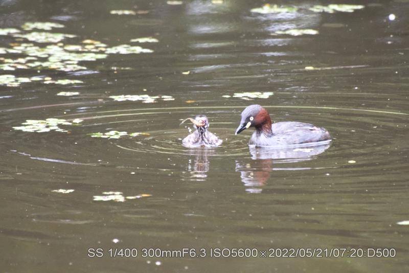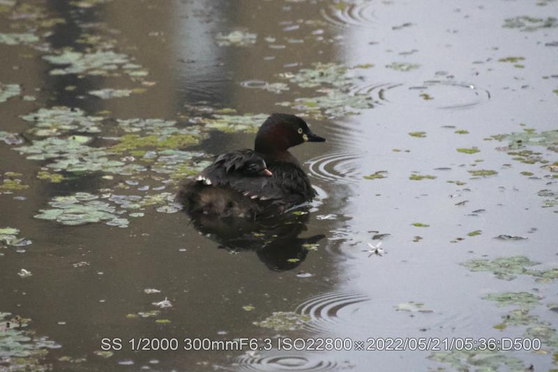 朝の往路で寄ってみた。親鳥の背でいた。どうも一羽のようだ。30分後の復路で寄ったら親鳥が必至で雛を捜していた。途中で諦めて一羽の雛に親鳥2羽で餌を世話していた。