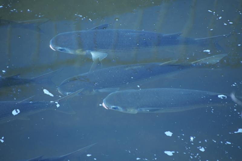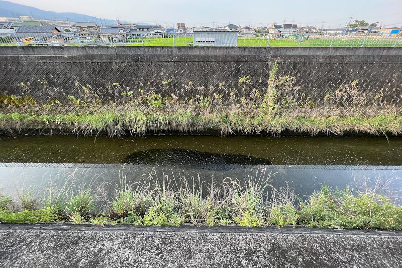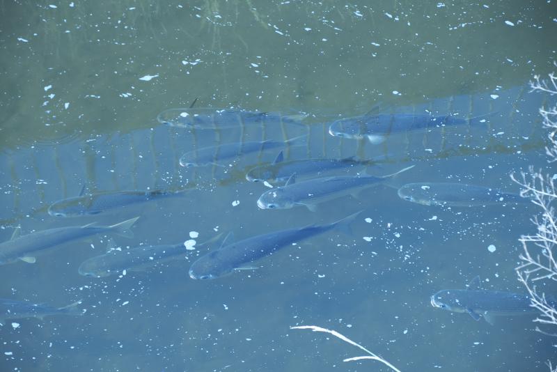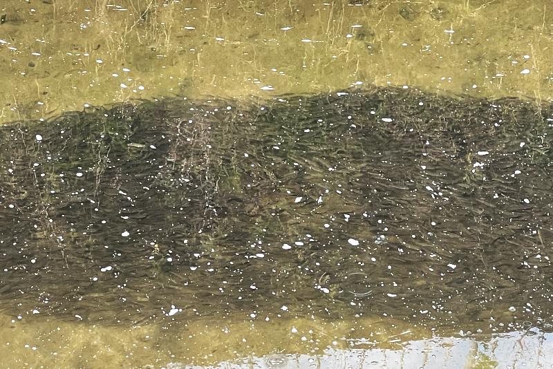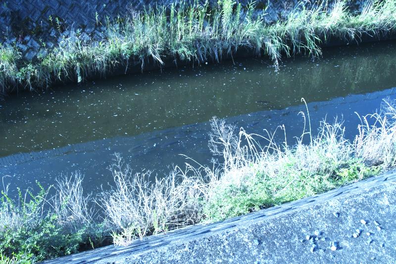 深北緑地横を流れる権現川支流。ボラの群れ。
