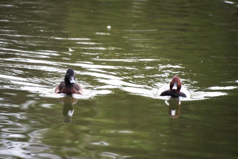 今朝もアカハシハジロは留守だ。2日目。つがいのように、仲良しのホシハジロ♂ができたようだ。餌のパンも今朝は効率よく投げ与えた。