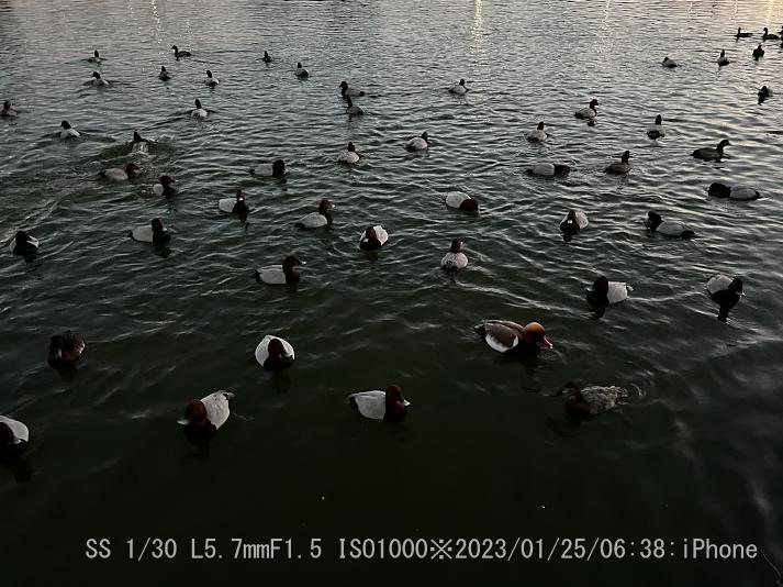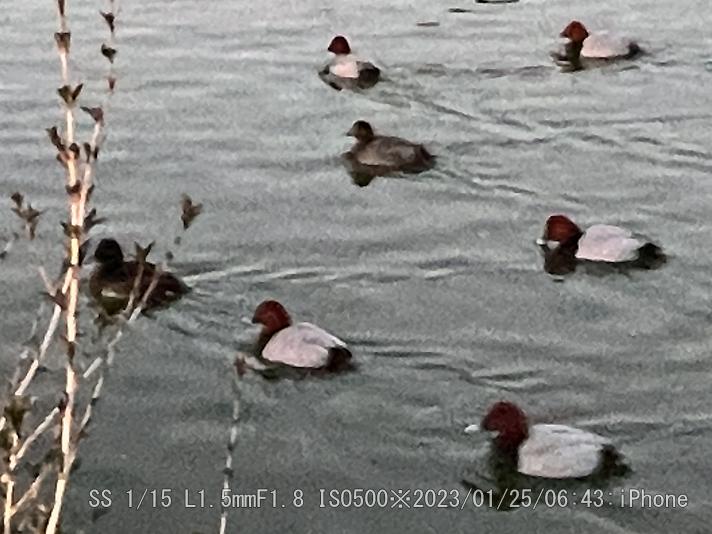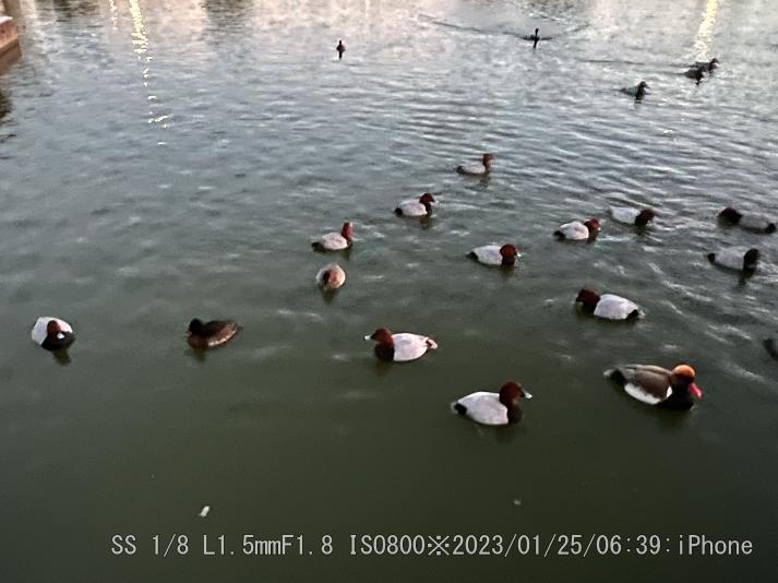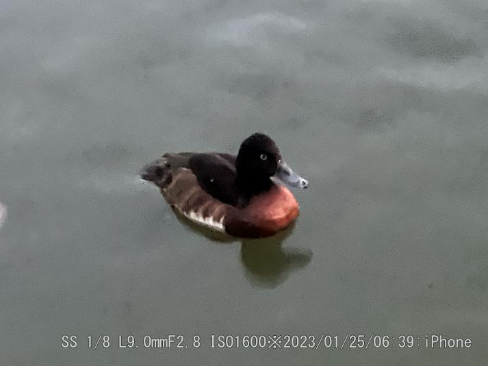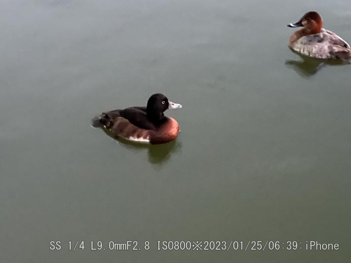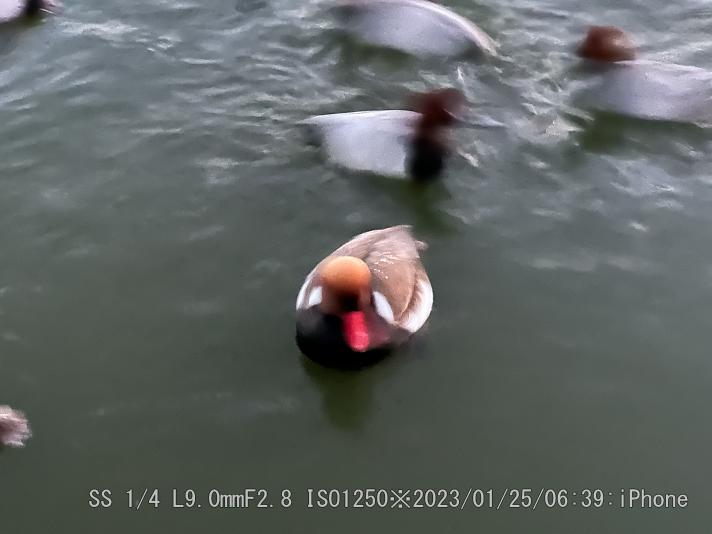 やはり赤っぽく写る。アカハシハジロは暗闇でもハッキリしている。暗い時はiPhone 13 Proが良く撮れた。