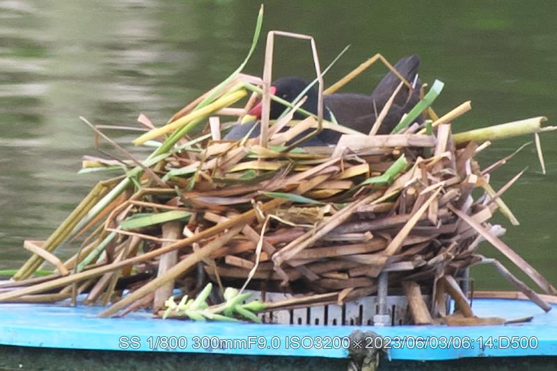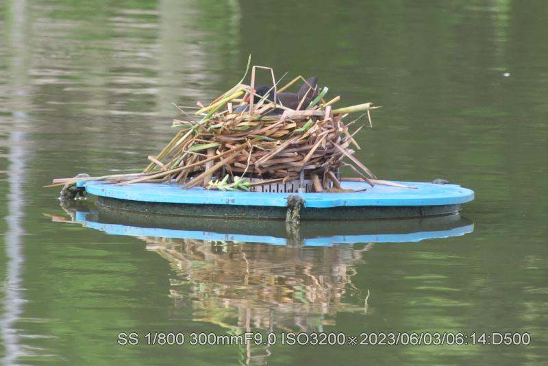 弁天池中央の噴水台に巣が完成したようバンバンオスがいる。
