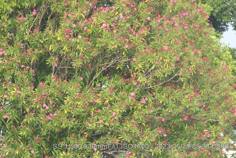 キョウチクトウ(夾竹桃)(キョウチクトウ科キョウチクトウ属)は常緑の中低木。神社横に大木が育って花は満開だ。車の排気ガスや大気汚染にも強く、緑化樹として公園や緑地などで植栽されていが、最近は危険だと言うことで見かける事が少なくなった。