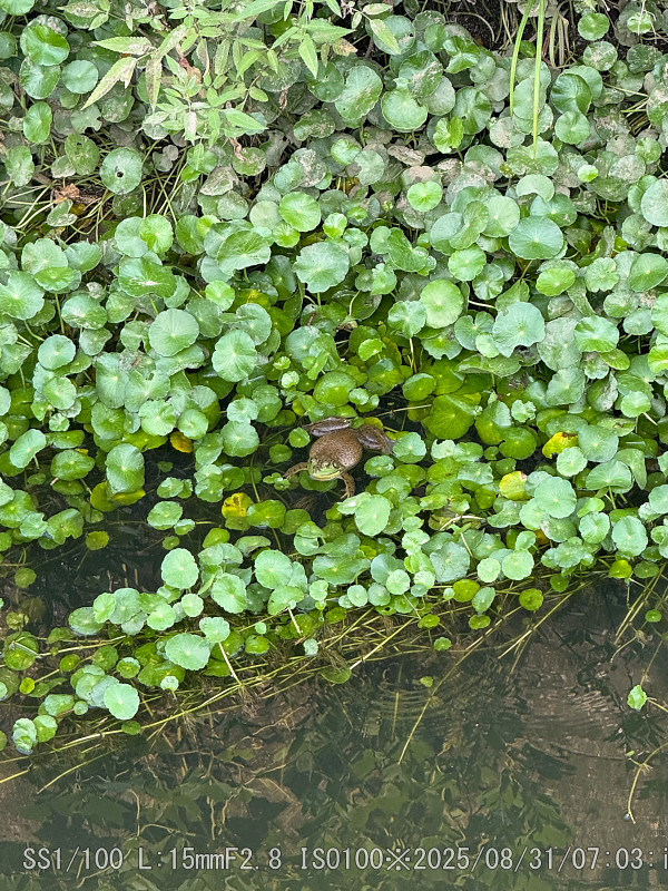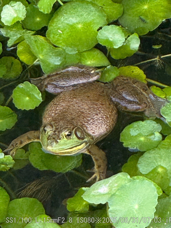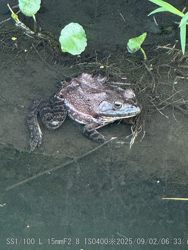 草の上は食用ガエル。黒っぽいのはガマガエルかな(目の後ろに10円玉ぐらいの耳が無い)