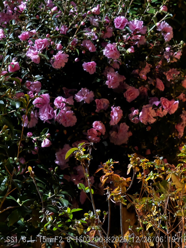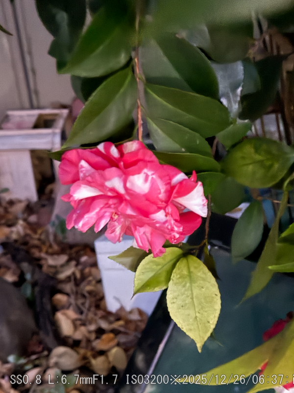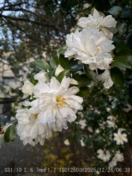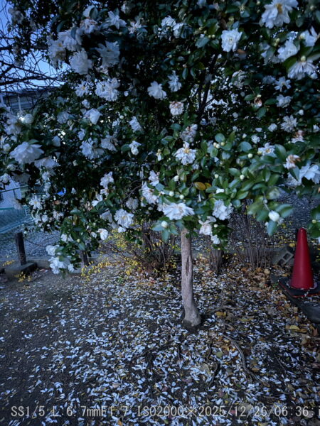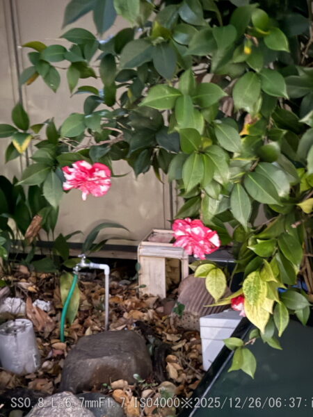 スマホカメラの手ぶれ補正は優秀だ。寒椿、散り椿、五色椿。