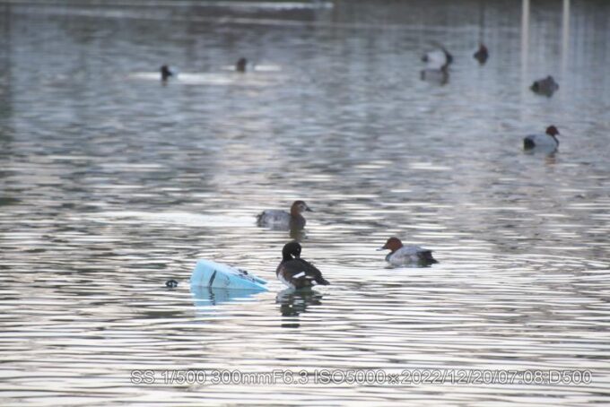 中央の浮きで羽づくろいして、くつろいでいる。今朝はアカハシハジロの姿が見えない。